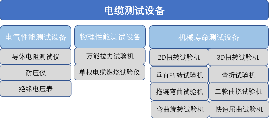以上标准中规定的电缆的性能测试项目包括三大类,分别是电气性能试验、物理性能试验、机械寿命试验,下图展示的是对具体的性能测试项目的分类汇总。