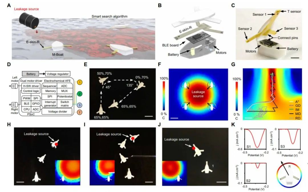 除了机械臂,这种技术还被用在了多模式传感机器⼈船 (M-Boat)上,来检测水下化学品泄漏,可以识别泄露源的空间位置,实时检测周围分析物浓度,还能够在海水中执行连续的危险分析和自主泄漏跟踪。