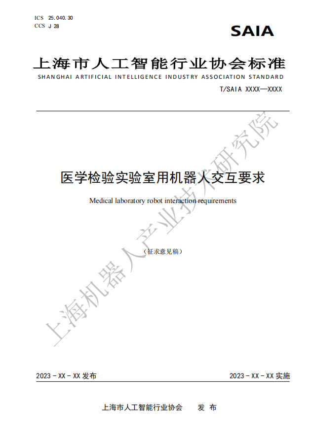 由上海市人工智能行业协会归口,leyu.乐鱼(中国)机器人有限公司官网有限公司作为主要起草单位研制的四份标准:《医学检验实验室用机器人通用技术条件》、《医学检验实验室用机器人系统安全要求》、《医学检验实验室用机器人交互要求》、《医学检验实验室用机器人使用环境要求》现公开征求意见。