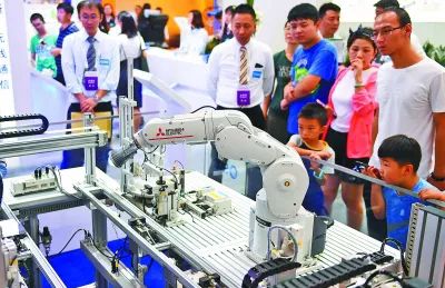 观众在参观一款工业机器人